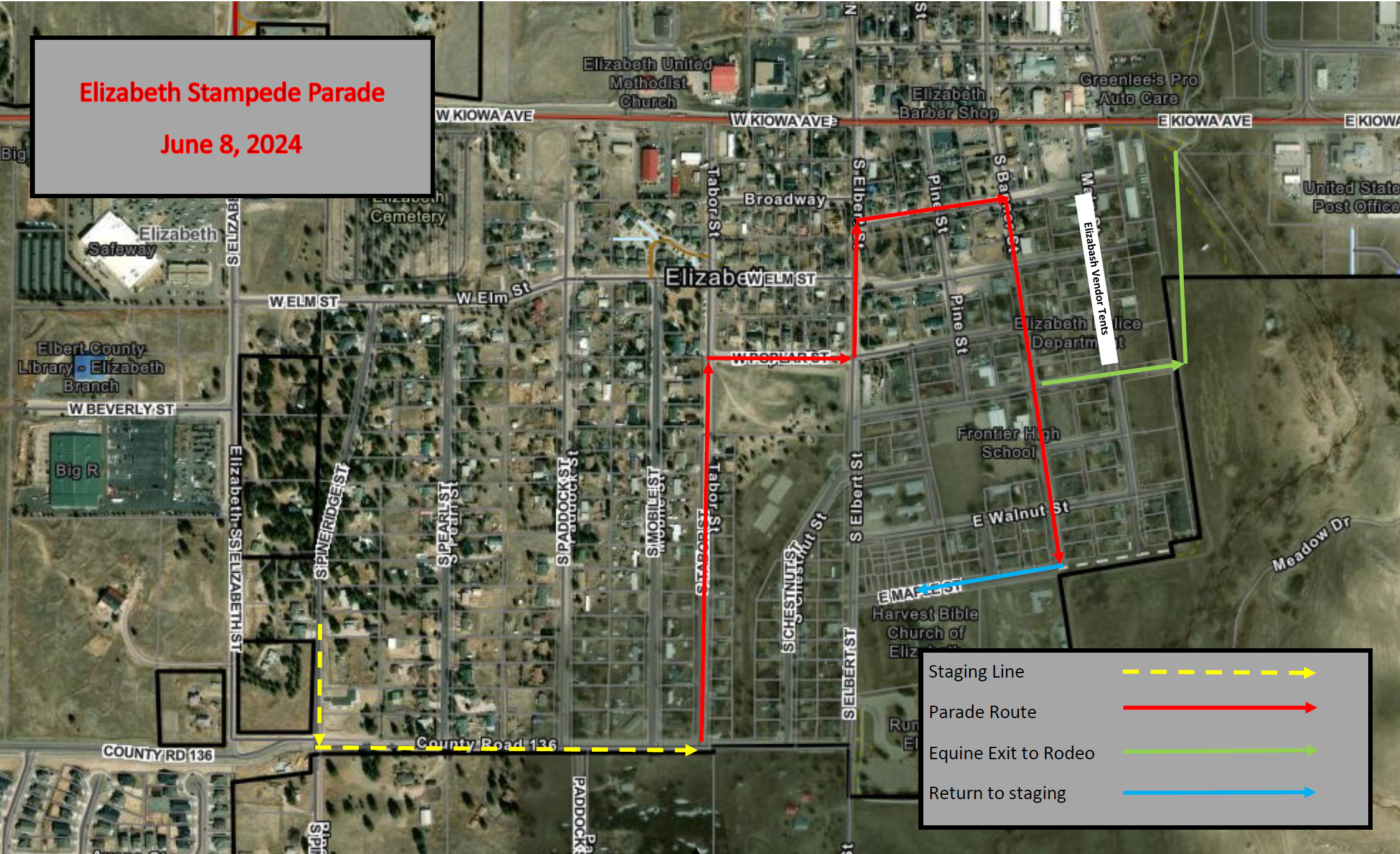 To Stage from Big R or the Library, please use the North exit and go North on South Elizabeth Street, head East on West Elm Street, and then South on Pine Ridge Street, then head East on County Road 136. Early stagers can stage on CR 136 all the way up to South Tabor Street. If you are later in the parade lineup you may be staged in line on Pine Ridge Street.