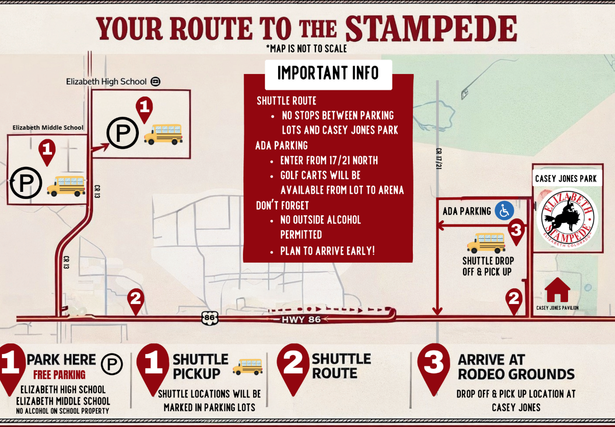 Complimentary shuttle buses, provided and paid for by the Elizabeth Stampede, will run continuously throughout the events offering direct transportation to and from Casey Jones Park.